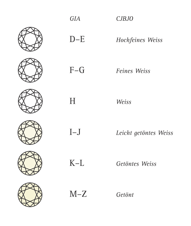 Diamanten werden farblich in Buchstaben von D bis Z kategorisiert. Wenn man von hochfeinem Weiss spricht, erwartet man die beste Farbe im farblosen Bereich. Viele Diamanten findet man jedoch in interessanten Gelb- bis Brauntönen. Absolute Raritäten sind Steine in den Farben Rosa, Blau, Grün, intensiv Gelb und Rot. Die sogenannten fancy diamonds. Solche bieten je nach Angebot interessante Investment-Möglichkeiten.