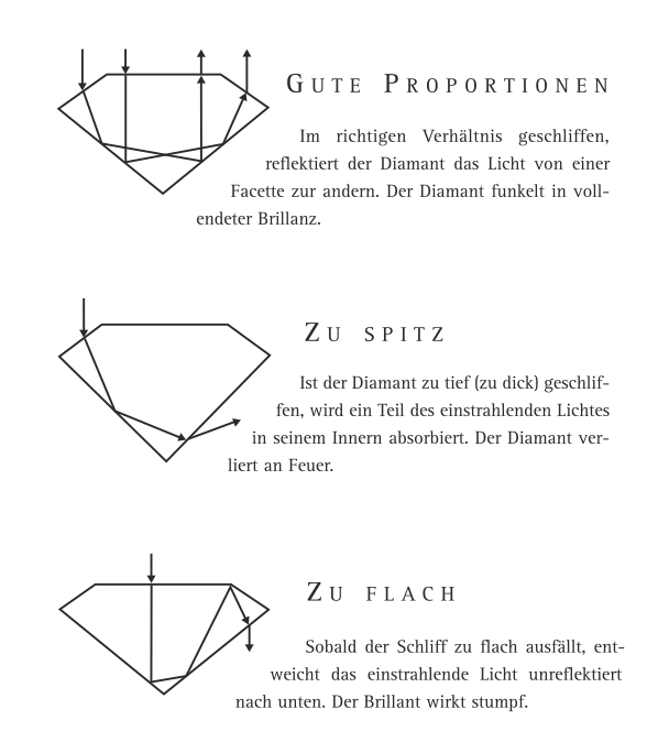 Der Schliff (Cut) ist das erste und wichtigste Qualitätskriterium beim Kauf eines Diamanten. Nur die weltweit erfahrensten Diamantschleifer geben dem König der Edelsteine seinen vollen Ausdruck. Symmetrie, Proportionen und die Politur sind entscheidend für Glanz und Wiedergabe der Spektralfarben. Nur durch den optimalen Schliff wird das Licht vollkommen reflektiert. Bei einem GIA-Zertifikat wird diese Perfektion mit excellent ausgezeichnet.